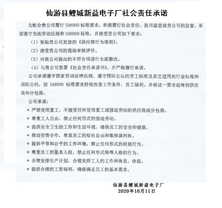 仙游县鲤城新益电子厂社会责任承诺